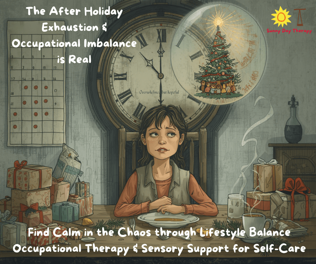 Dr. Kimberly Day at Sunny Day Therapy is trained in lifestyle redesign, a specific type of therapy, that uses tools to manage time, design environments, and enhance occupational balance. She is also trained in holistic, whole body strategies including sensory integration, body work, and breathing to enhance physical & mental strength. If one of the above categories stood out to you as being out of sync in your life, know that our tools to promote executive function (clarity & organization of thoughts & behaviors), physical calming, and intentional design of the environment, can help you and your family focus and find calm in the holiday chaos. Our wellness plans and goals prepare you to transition to and through seasons of change with compassionate support. The holidays are stressful for everyone- but certain types of conditions are particularly at risk for stress such as those with neurodivergence (ADHD, autism, OCD, anxiety, etc.), new parents, those transitioning into new roles, students experiencing anxiety, grief, or changes, caregivers of those with disabilities, etc. Feel empowered with our therapy through connection. We are here for you through seasons of stress and change. We love helping you navigate your health journey; whether you are facing a new diagnosis or just need help coping with a time of change or lack of routine (what we call occupational disruption), we have tools to help you feel more in control and confident to manage your symptoms.