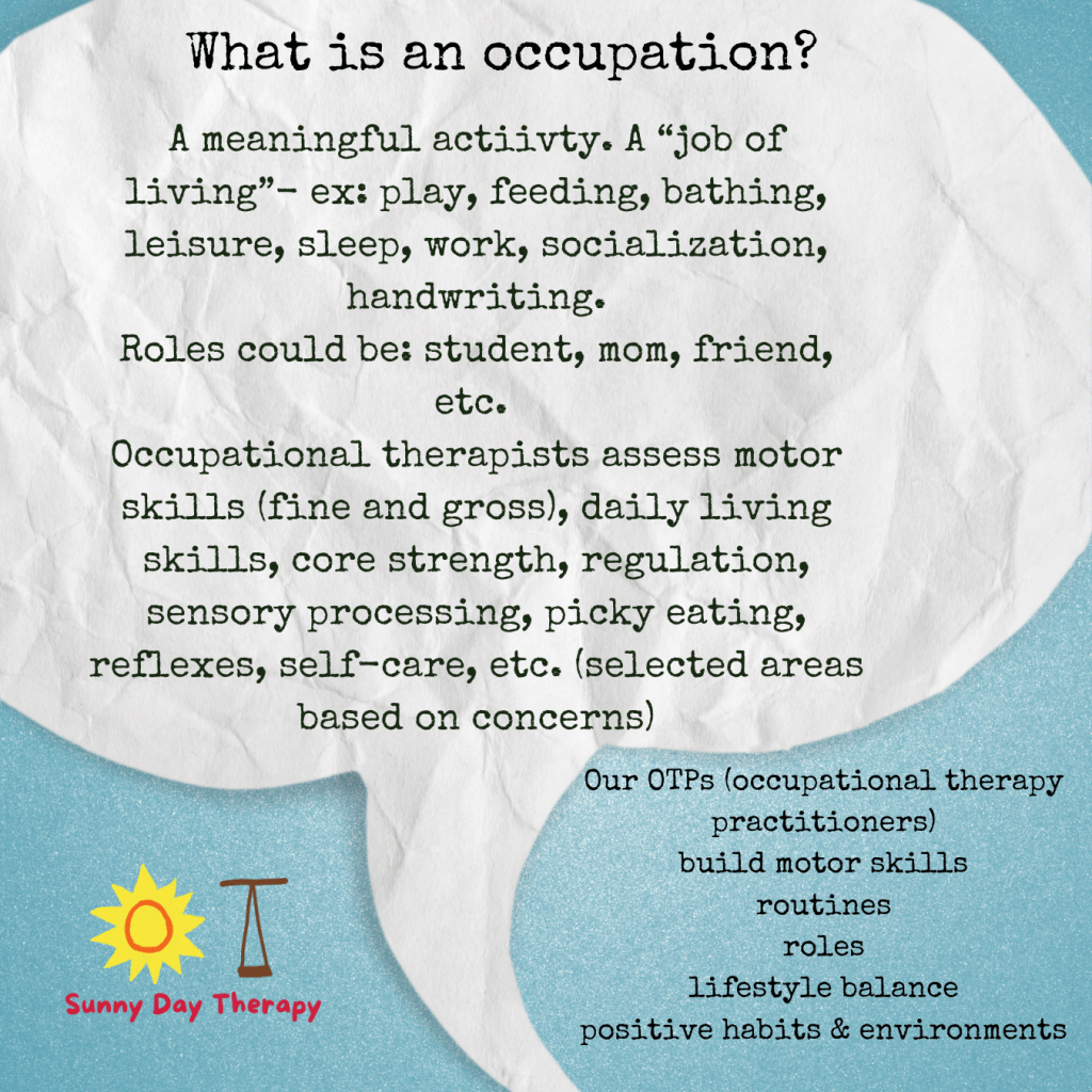 Happy occupational therapy month to occupational therapy practitioners, students, and clients. When we say occupation in the context of occupational therapy, we are talking about more than “just a job”. We are talking about any activity of meaning or value to a client. It is the meaning making and emphasis on client-centered participation in daily activities that makes OT unique. Evidence suggests that change happens and lasts longer when clients are invested in their activity goals. For example, a study showed that rats who exercise on a wheel gain muscle when they voluntarily get up on the wheel. When they are forced to get on the wheel, the stress of being forced does damage to their health and they actually LOSE muscle mass. Medicine is finally supporting what OT founders have been saying all along- what clients think, value, and want to do matters. We should use client interests, values, and roles to help them achieve their goals. Our OTs use comprehensive and client-centered evaluation interviews that are based on standardized measures and theories… supported by research to help clients identify goals and track progress. Examples of goals identified by clients or their caregivers may include: improving focus, trying new foods, exploring their senses in a playful way, practicing socialization. We see clients who are anxious about transitions, unmotivated to get tasks done, and clients who have typical OT motor concerns (handwriting, core strength, dyspraxia, dysgraphia, sensory processing, reflexes, grasp patterns, hand strength etc.) While there are many areas we would like to help with, we along with clients choose as a team what matters most to the client to get tasks done in their environments first. Regulation first is often a statement we say because we know that when clients are connected and regulated, they are in a state to learn. We first help clients who want to understand their body signs in language and with tools that make sense to them; we give them a practical, tangible plan to manage their stress so that they do not get stuck in the fight-flight-or-freeze system of their nervous system. We know that when clients are regulated, they are better able to focus and get daily tasks done. We have specialized tools that help set up systems and environments efficiently to promote balance and sensory calming. We are prepared to help you through new diagnoses, through seasons of stress, and through specific problem behaviors or emotional anxiety/funk that emerges. We OTs are your problem solvers for life. We have tools to help you grow physically, emotionally, and cognitively strong.